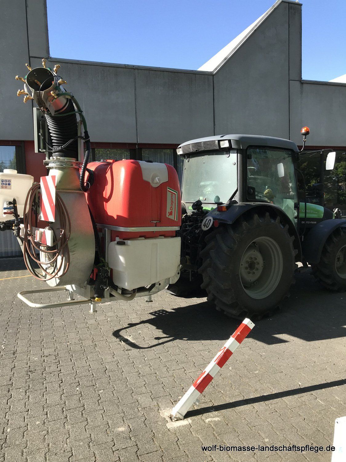 Unsere Traktoren sind mit so genannten gebläseunterstützten Motorspritze ausgestattet.Eine elektrostatische Aufladung des Spritznebels sorgt für eine verbesserte Blattanhaftung. Die Spritze wirft bis zu 30 m weit.